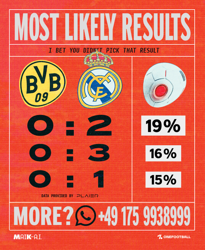 3. Falls ihr in eurer Tipprunde glänzen wollt, bekommt ihr jetzt von MAIK mit AI die wahrscheinlichsten Endergebnisse für das Champions League Finale zwischen Borussia Dortmund und Real Madrid: