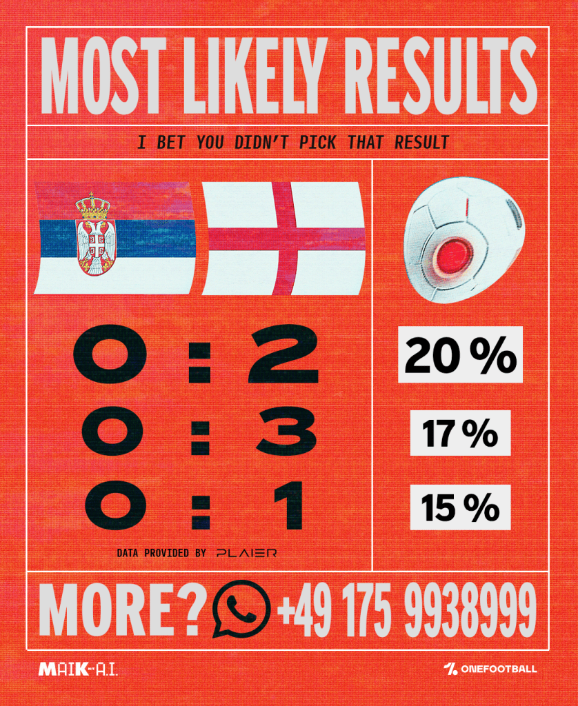 Zum Schluss noch Top-Favorit England (92% Gewinnchance) gegen Serbien (0,45%):