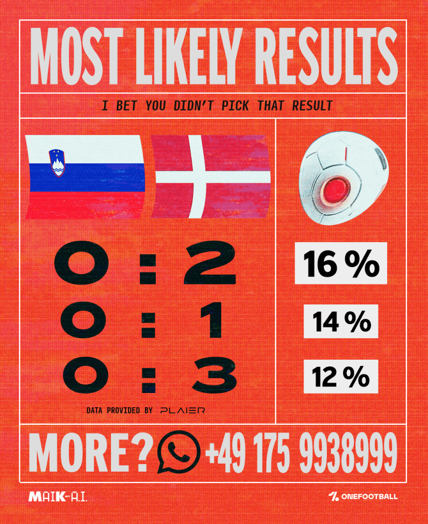 Ähnlich klarer Favorit ist Dänemark (78% Gewinnchance) im Spiel gegen Slowenien (6,8%) und diesen möglichen Ergebnissen: