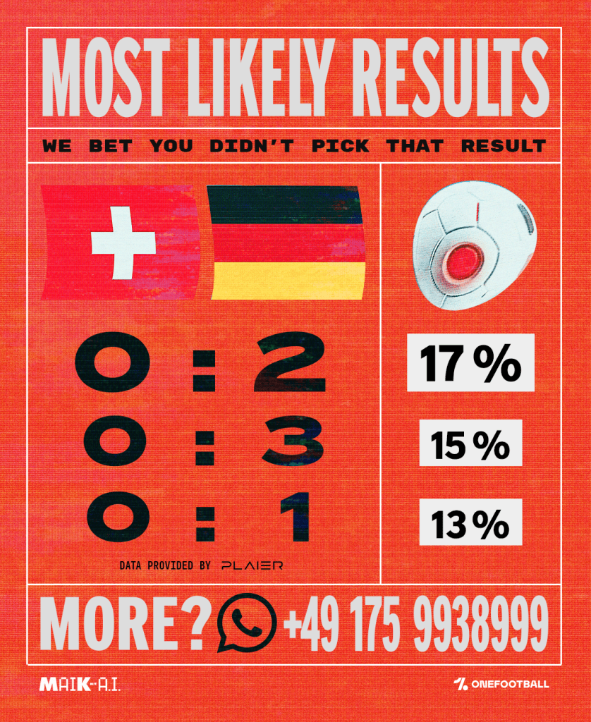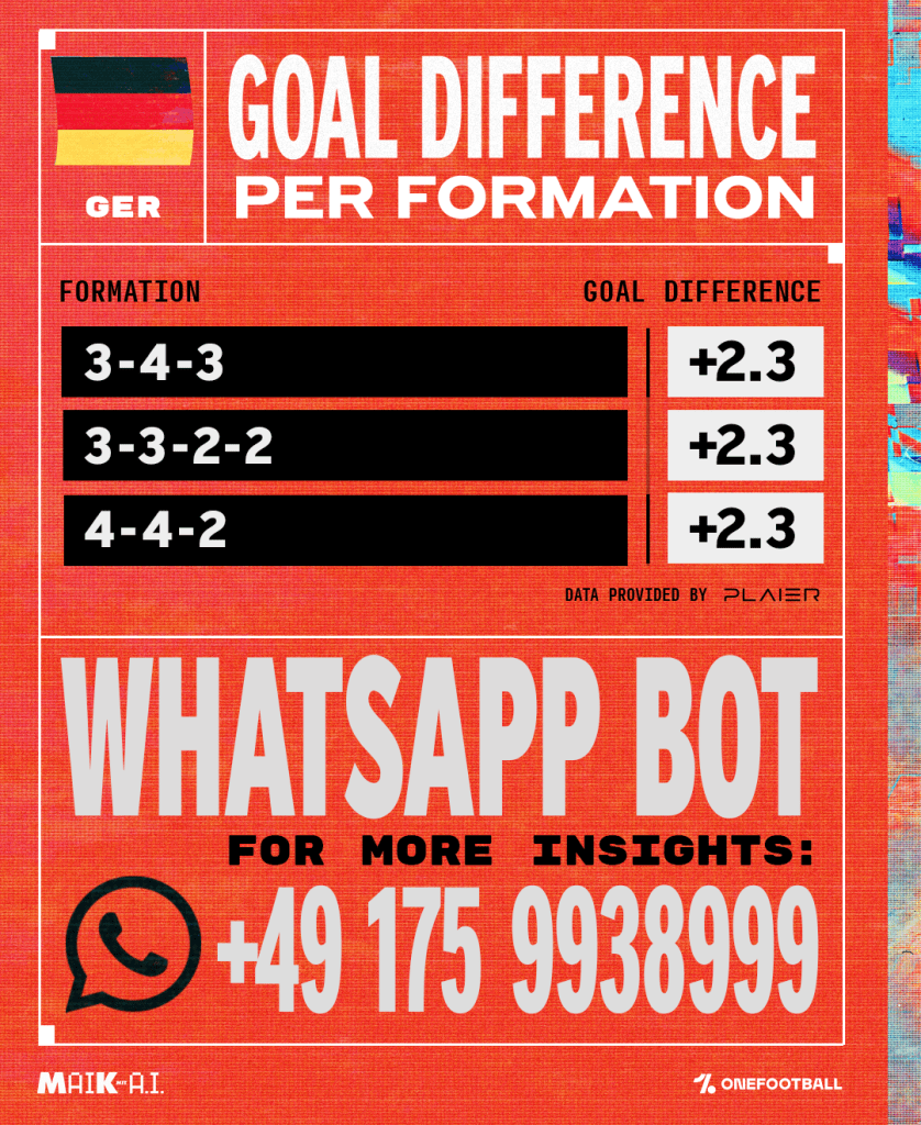 Julian Nagelsmann lässt ja gerne in der Formation 4-2-3-1 spielen, was natürlich bis heute super erfolgreich war und sicher auch so bleibt. Interessanterweise sieht die AI von PLAIER das System nur als die 10. beste Variante im Spiel gegen die Schweiz. Auch damit würde das deutsche Team gewinnen, aber nur mit einer Tordifferenz von +1,9 Toren. Die drei erfolgreichsten Formationen wären diese hier: