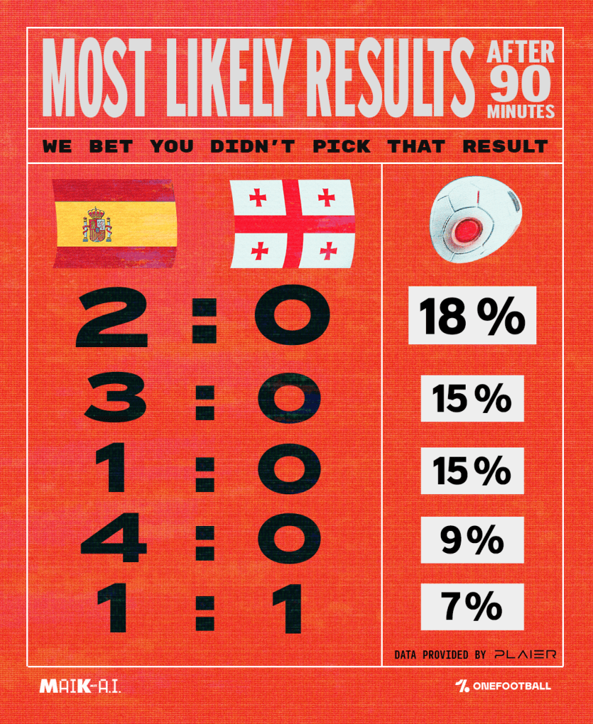 Heute Abend verleben wir laut KI einen relativ ruhigen Abend. England gewinnt mit 93,5% Wahrscheinlichkeit gegen die Slowakei (0,3%) und Spanien mit 93% Wahrscheinlichkeit danach gegen Georgien (4%).