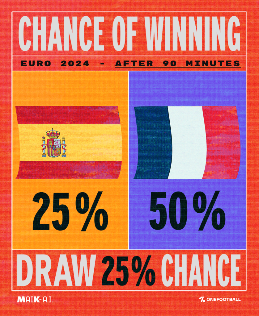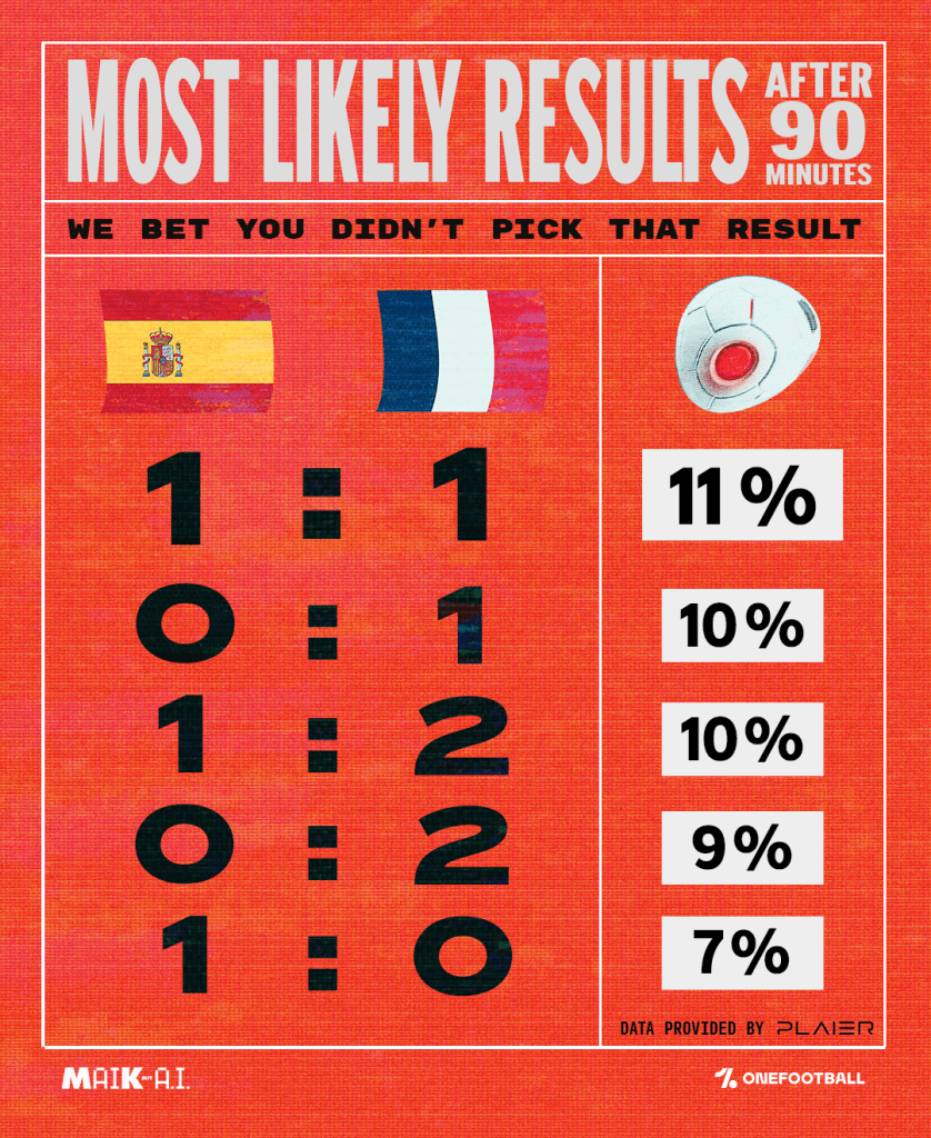 Das wäre heute unser Halbfinale gewesen. Deutschland gegen Frankreich in München. Stattdessen also Spanien gegen Frankreich. Und wie nicht anders zu erwarten, wird das eine enge Kiste. Nach 10.000 Simulationen mit der AI von PLAIER sieht MAIK mit AI Frankreich leicht vor Spanien.