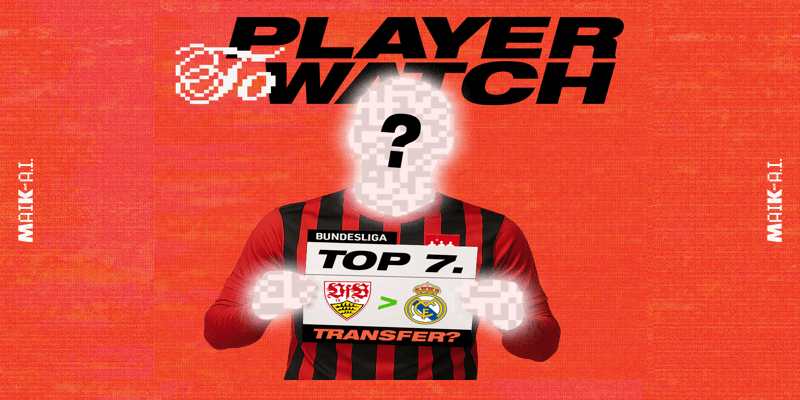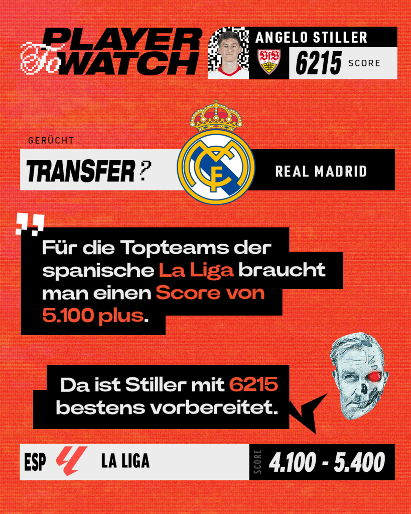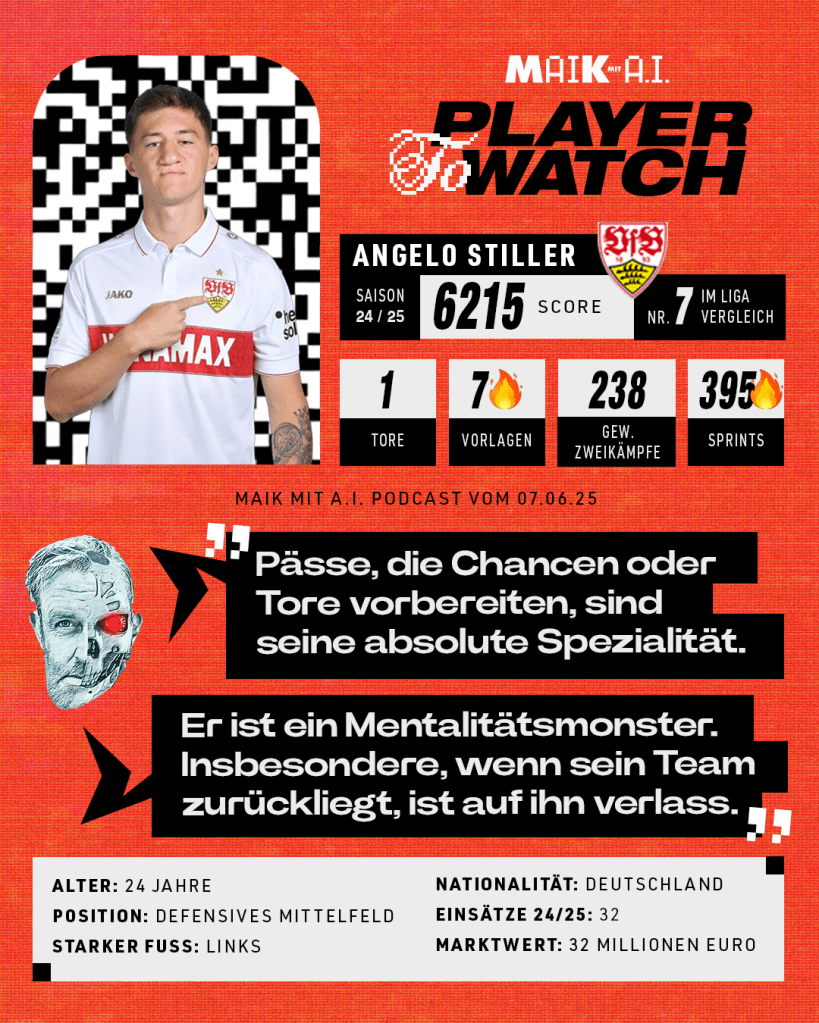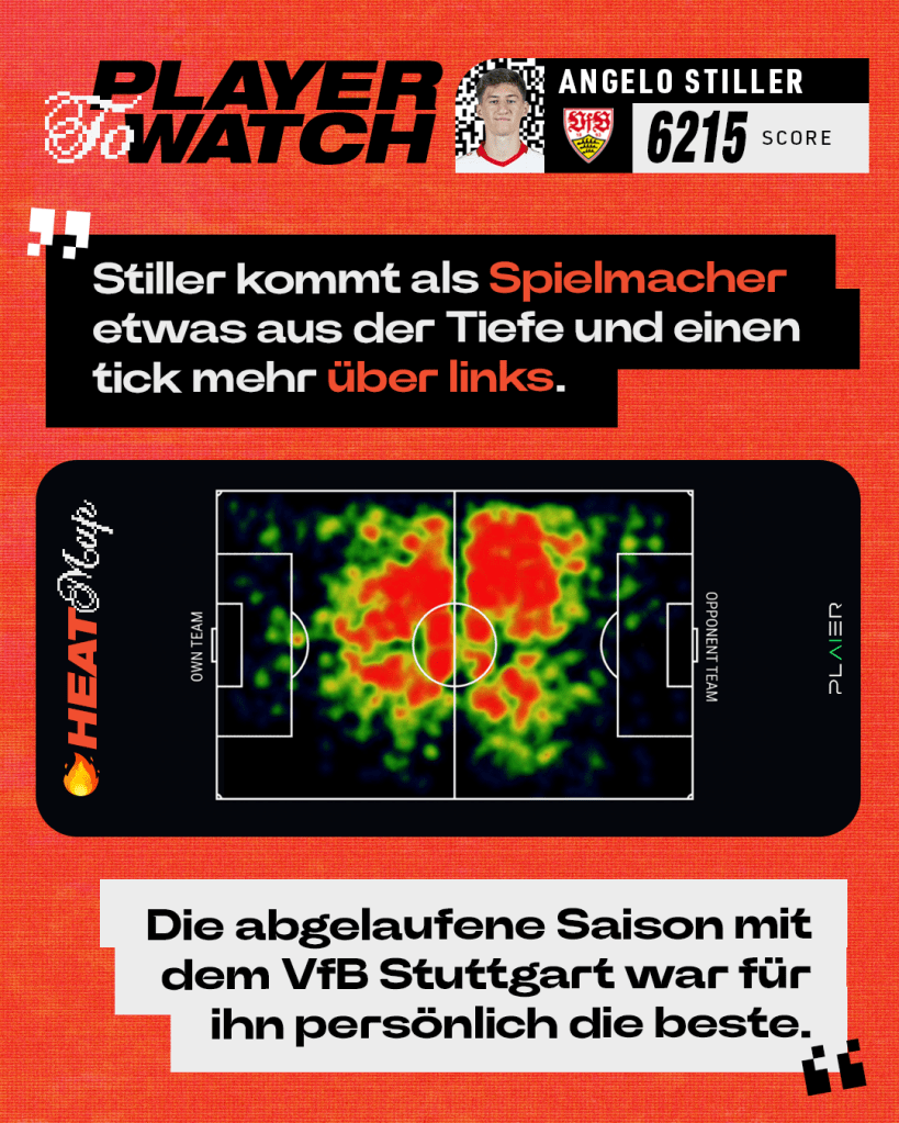 Angelo Stiller ist einer DER Spieler der abgelaufenen Saison. Mit einem PLAIER-Score von 6.215 hat er sich in den erlauchten Kreis der 6000er in der Bundesliga gespielt. Insgesamt belegt er Platz 7 der besten Spieler der Liga. Hier sein MAIK mit AI PLAYER TO WATCH Daten-Karussell: