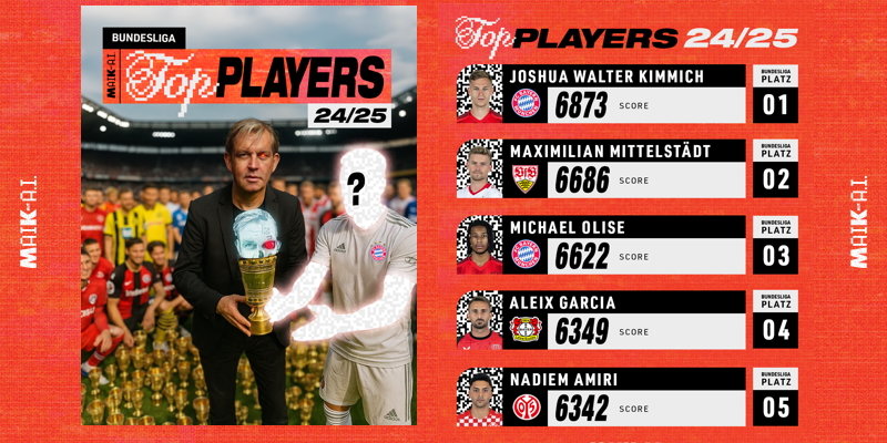 Platz 5 wird euch umhauen. Müsste ich jetzt schreiben. Aber lassen wir das mit dem Clickbait. Aber eigentlich wird euch Platz 5 wirklich umhauen. Vielleicht sogar alle fünf Spieler, weil man natürlich sofort Musiala oder Wirtz im Kopf hat, wenn es um die besten Spieler der Bundesliga geht.