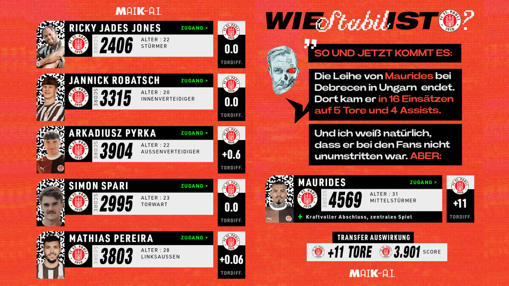 Wenn ihr jetzt auf die Liste der Neuzugänge schaut, seht ihr einige ganz solide Verpflichtungen. Aber der Knaller ist Maurides, dessen Leihe bei Debrecen in Ungarn endet.